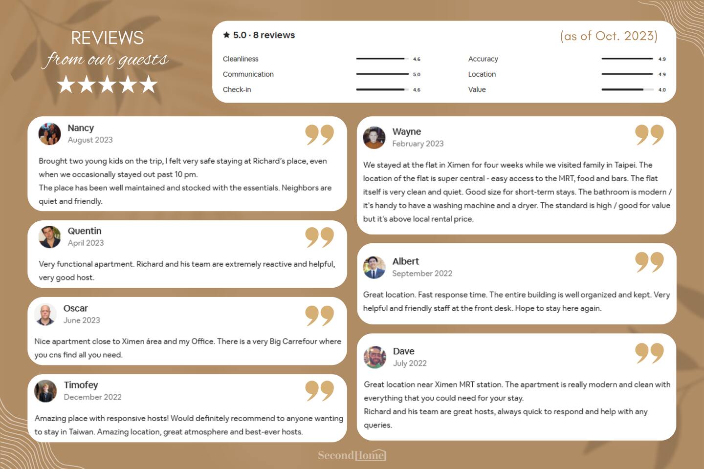 Next to Ximen Shopping District, the most prime location in Taipei for shopping. Wanhua District is the most historic district in Taipei and is home to many historical buildings including the 18th-century Longshan Temple, with its intricate wood carvings, colorful figures, and striking pillars as well as the Red House Theatre, the first and largest teahouse and playhouse in Taiwan. It is also home to the busy Snake Alley night market on Huaxi Street brimming with food stalls where you can try all sorts of Taiwanese delicacies. Attractions: Lungshan Temple - 10 min walk The Red House – 5 mins President Hall Plaza – 12 mins Taipei Botanical Garden – 15 mins Tattoo Street – 8 mins Cinema – 8 mins Liberty Square Arch – 19 mins National Chiang Kai-shek Memorial Hall – 20 mins Thermal Valley – 28 min drive National Dr Sun Yat-Sen Memorial Hall – 15 min drive Taipei Zoo – 27 min drive Parks: Laosong Park – 5 min walk 2/28 Peace Park – 15 mins Taipei Cinema Park – 10 mins Longshan Riverside Park – 20 mins Daan Forest Park – 10 min drive Shopping: Taipei City Ximen Market – 5 min walk Carrefour Guili Store – 3 mins Taipei City Mall – 20 mins Shi-Men Ting Shopping district – 10 mins