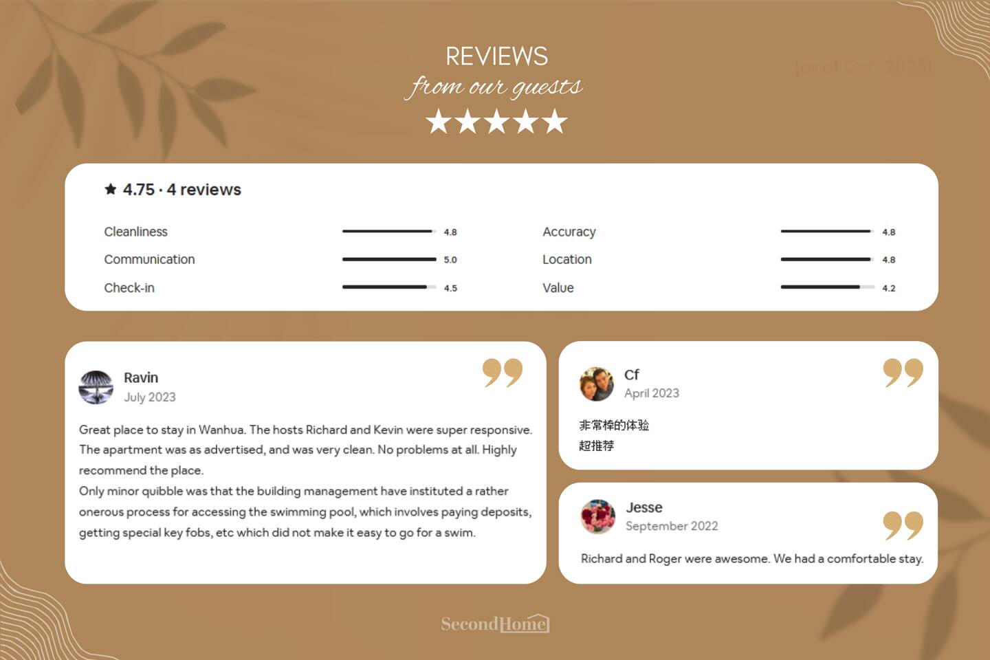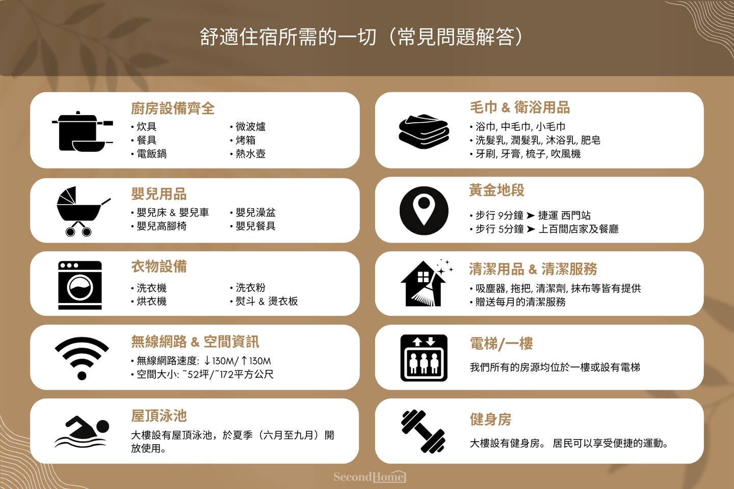 As soon as you step foot in the contemporary apartment, you're welcomed by a very stylish yet extremely comfortable open-plan living area. It is designed and decorated in an elegant manner that compliments the breathtaking, unrestricted, and #instaworthy views of Taipei! The dining area opens onto the entertaining living room, setting the tone for many memorable evenings. Plenty of natural light coming through the modern floor-to-ceiling windows makes the whole apartment very bright during the entire day. The best is yet to come! Retreat to one of the bedrooms, which feature 5☆-resort comforts that allow you to rest after an exciting day of exploring the city. ★ LIVING ROOM ★ It immediately feels like home, with comfy sofas, a coffee table for snacks and drinks, and a smart TV for movie nights. Those traveling on business can easily set up on the work desk by the window. Don't let the stunning view distract you from your work. ✔ 50" 4k Connected TV ✔ Comfortable L-Shaped Sofa with Pillows & Blankets ✔ Stylish & Useful Coffee Table ✔ 3 Office Desks with Chairs ✔ 2 Balconies ★ KITCHEN & DINING ★ It is fully equipped with state-of-the-art cooking appliances that make it suitable for preparing any meal, whether it is a simple breakfast, quick snack, or a gourmet dinner. ✔ Microwave ✔ Stove ✔ Oven ✔ Refrigerator/Freezer ✔ Dishwasher ✔ Rice Cooker ✔ Kettle ✔ Glasses ✔ Silverware ✔ Pots & Pans You will find a lovely dining area between the living room and the kitchen. Serve your delicious meals at the cozy dining table if you choose to stay in and enjoy a home-cooked meal. ✔ Dining Table with 6 Stools ★ SLEEPING ARRANGEMENTS – 4 BEDROOMS ★ After an exciting day of adventuring throughout Taipei City, you will be looking to rest for an equally entertaining tomorrow. Once you are ready to relax, please make your way to comfortable bedrooms. ♛ Bedroom 1: King-Size Bed ♛ Bedroom 2: Double Bed ♛ Bedroom 3: Double Bed ♛ Bedroom 4: Single Bed All offer equally high levels of comfort and amenities to provide you with all the rest you need on your travels. ✔ Pillows, Linens, and Sheets ✔ Wardrobes with Hangers and Shelves ✔ Nightstands with Reading Lamps ✔ Office Desk (in Bedroom 1) ★ BATHROOM ★ The apartment features a convenient full bathroom stocked with all essential toiletries designed to provide you with a relaxing bath experience. ✔ Shower Stall ✔ Japanese Bidet ✔ Mirror ✔ Toilet ✔ Hair Dryer ✔ Towels ✔ Essential Toiletries ★ BALCONY ★ There are two balconies which you can access at any time. Kick-start your day with a cup of fresh coffee and breathtaking views of the city. Once of which is a service balcony, which includes: ✔ Washer ✔ Dryer ✔ Detergent ✔ Cleaning Supplies ✔ Ironing Board & Iron (Stored in the Apartment) We look forward to hosting you. Please let us know if you have any questions; we're locals; we have the answers. Happy Travels!
