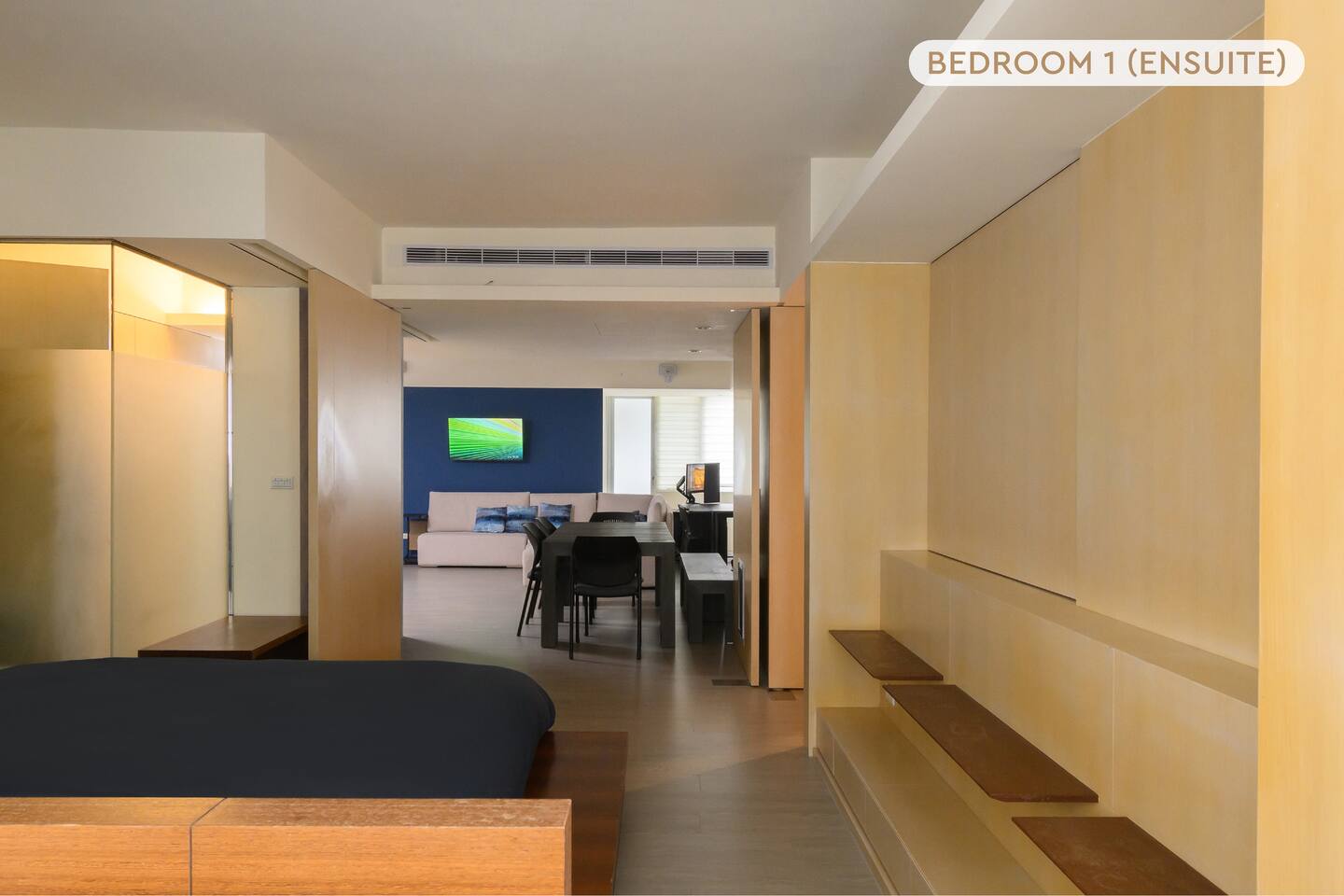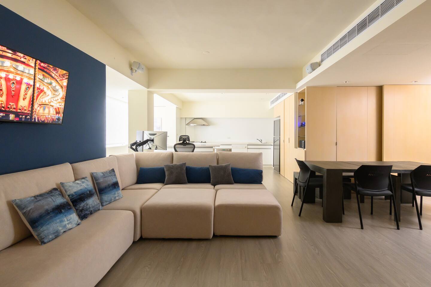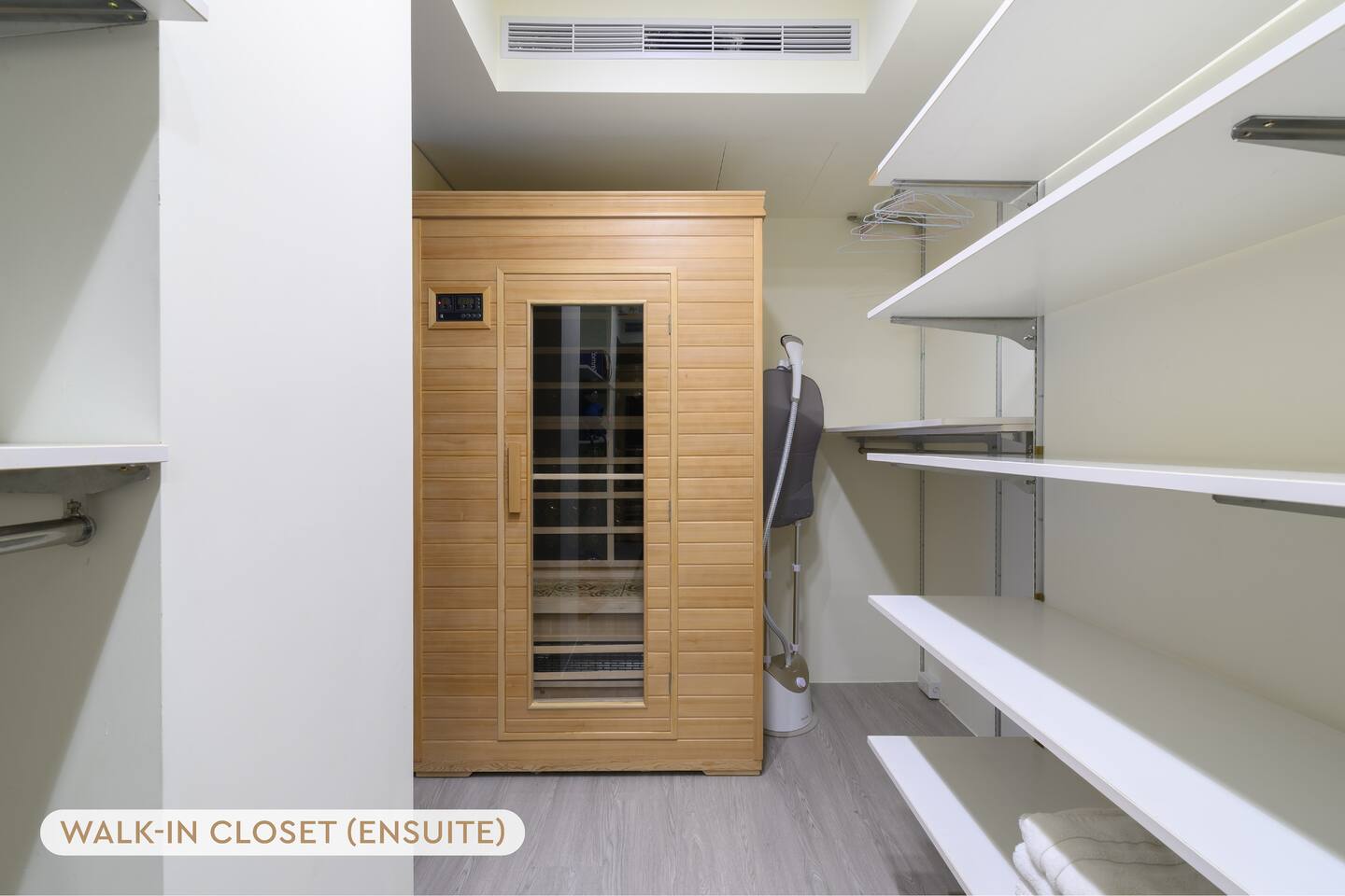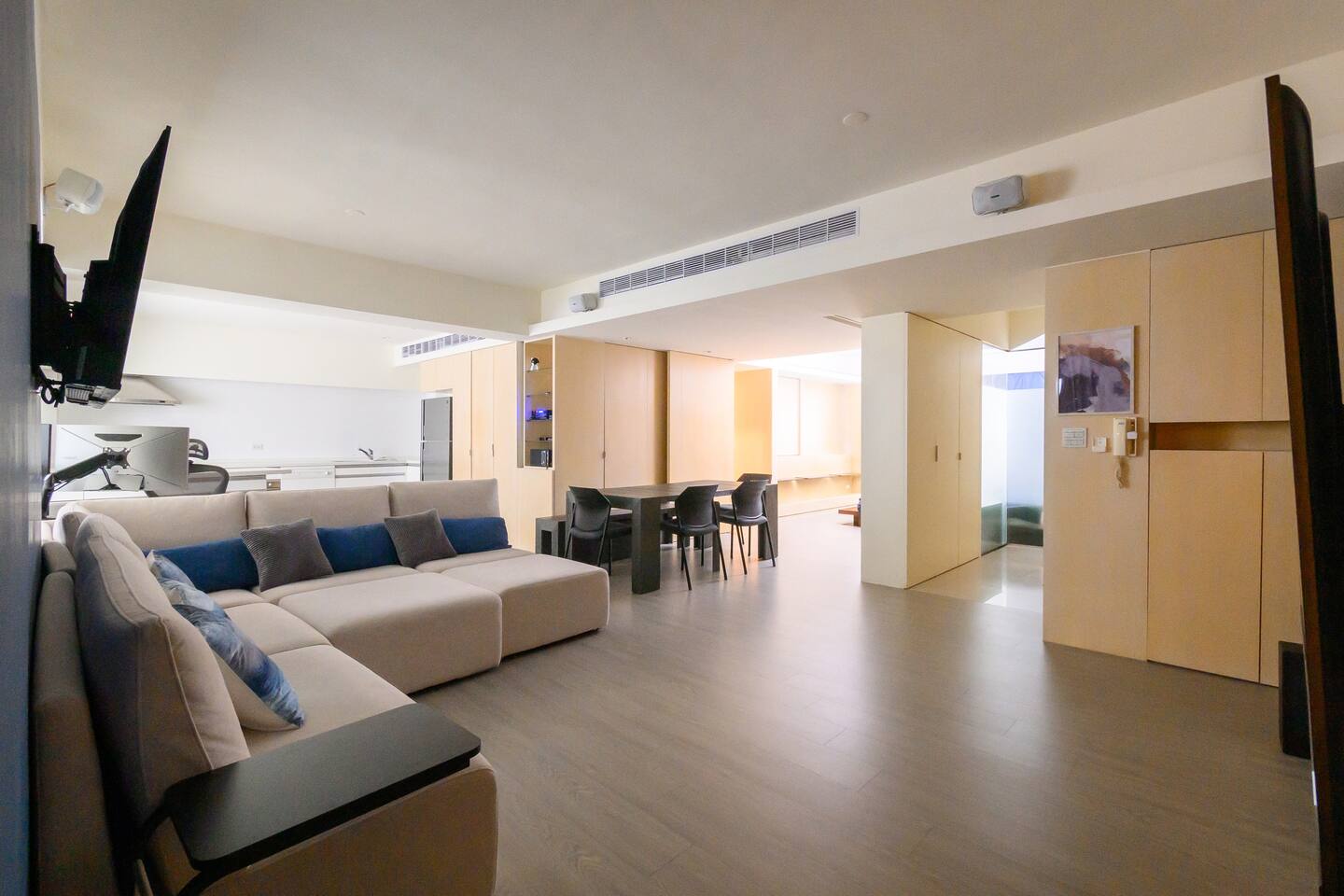 ★ Spacious & Stylish Living Room: • 70"" Smart TV w/TV Box • 43"" Smart TV Monitor • Soundbar system • Comfortable Modular Sofa (Seating for 6) • Open Space w/Workspace, Kitchen & Dining Area ★ Convenient Workspace: • Herman Miller Office Chair • Height Adjustable Desk (Sitting or Standing) • Ample Natural Lighting • Open Space w/Living Room, Kitchen & Dining Area ★ Open Space Dining Area: • Dining Table • Seating for 6 • Open Space w/Living Room & Kitchen ★ Fully Equipped Large Kitchen: • Dishwasher • Rice Cooker • Microwave • Oven • Air fryer • Electric Kettle • Cookware • Dinnerware • Kitchen Island w/Sink • Cleaning Supplies • Ample Natural Lighting ★ Master Bedroom (En-suite): • Extra Large King-sized Bed (124*259cm) • Bookshelves • Ample Natural Lighting • Private Attached Walk-in Closet w/Sauna • Private Attached Bathroom ★ Cozy 2nd Bedroom: • Double-sized Bed • Desk & Office Chair • Closet • Natural Light ★ Spacious & Relaxing Bathroom 1 Attached to Bedroom 1: • Bathtub & Shower • Japanese Heated Bidet Toilet • Dual Sink • Essential Toiletries Provided • Hairdryer Provided • Towels Provided • Attached to Walk-in Closet w/Sauna ★ Bathroom 2: • Shower Stall • Japanese Heated Bidet Toilet • Essential Toiletries Provided • Hairdryer Provided • Towels Provided ★ Convenient Service Balcony: • Washer • Dryer • Detergent • Cleaning Supplies • Iron Board & Iron (Stored in the Apartment) • Ample Natural Light
